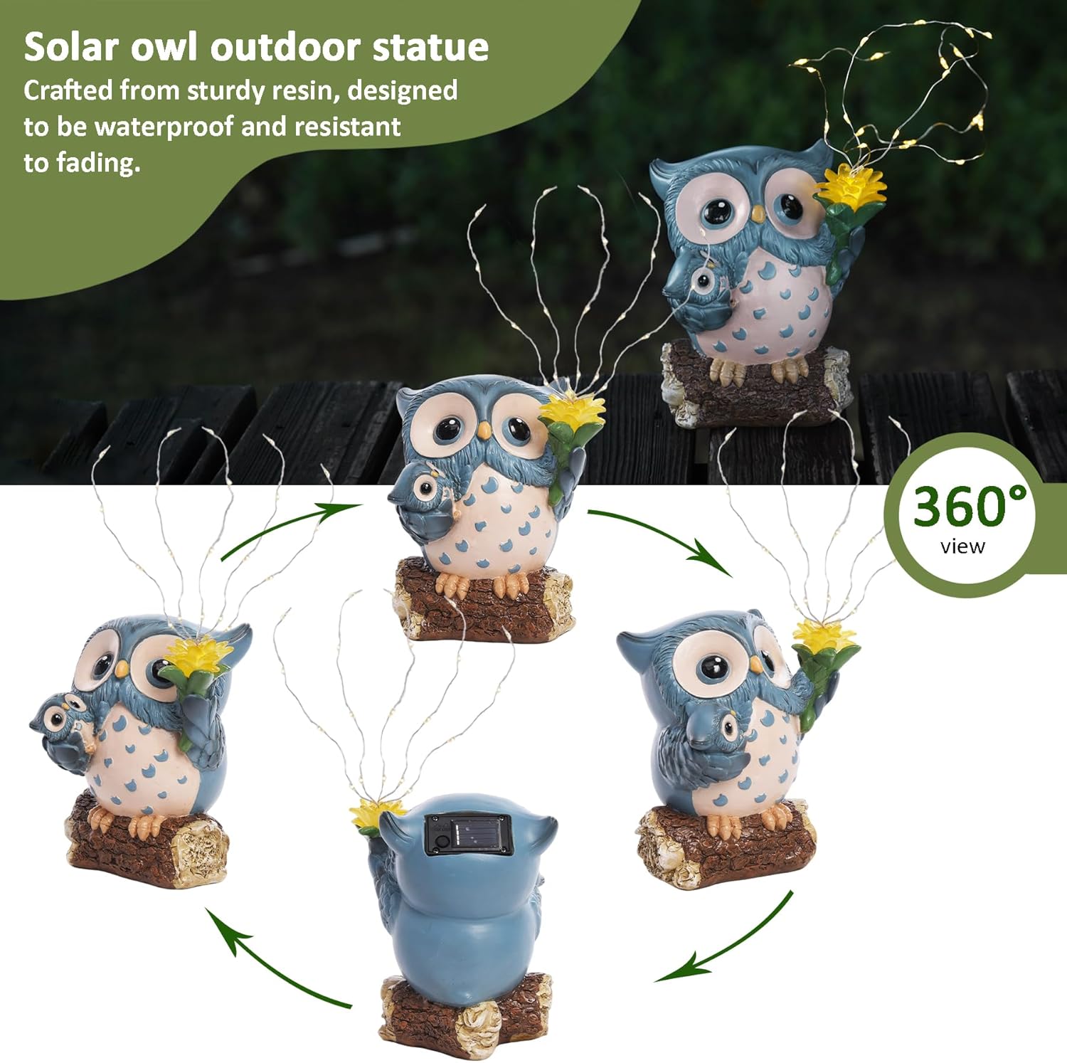 - Funny Owl Garden Statues: Charming owl decor shows a mother owl holding her baby while standing on a tree branch, gently shining a lantern toward the sky as they gaze at the stars. This heartwarming scene is full of childlike wonder. Perfect garden decorations for patios, porches, yards, balconies, fences, or walkways. A magical touch to your outdoor garden decor.