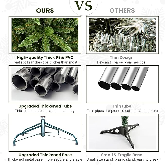 - High-Quality Materials: Crafted with 100% new PE and PVC, 6 feet fake Christmas tree is fire-retardant, non-allergenic, odor-free, and fade-resistant. Paired with a reinforced heavy-duty metal stand, it ensures long-term stability and durability throughout the season.