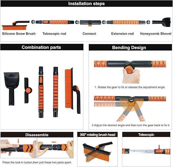 - [Telescopic Pole with Comfort Grip] The multi-section pole allows for smooth length adjustment to suit your height and the task at hand. It is constructed from cold-resistant aluminum for reliable performance in low temperatures. The handle is equipped with a thick, warm foam grip for a comfortable and secure hold
