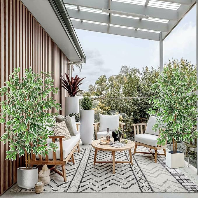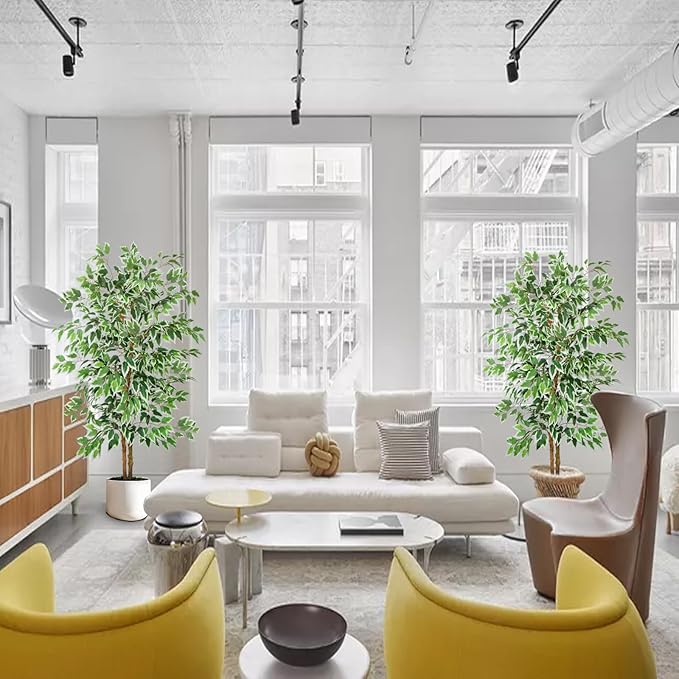 - Product Information: Includes 2 packs artificial ficus tree. Potted ficus tree is 5 feet tall, black pot is 4.5 inches tall / 6 inches wide. It weighs about 19 pounds (The size and weight of each tree is subject to error). The artificial tree look more farmhouse and is suitable for decorating on patios, bedroom, living room, autumn, Christmas indoor and more