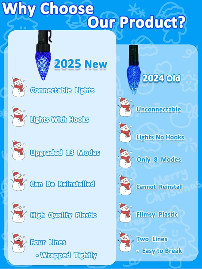 - IP44 Waterproof C6 Lights for Outdoor Use: The waterproof twinkle lights can be used both indoor and outdoor. Whether it's raining, snowing or windy, our lovely C6 strawberry lights will still work great in your yard. These blue Christmas fairy lights are spirally connected and are very secure. The durable and solid plastic shell will not be broken by snow or high temperature weather suitable for outdoor use. It will be the most shining part of your 2025 Christmas season.