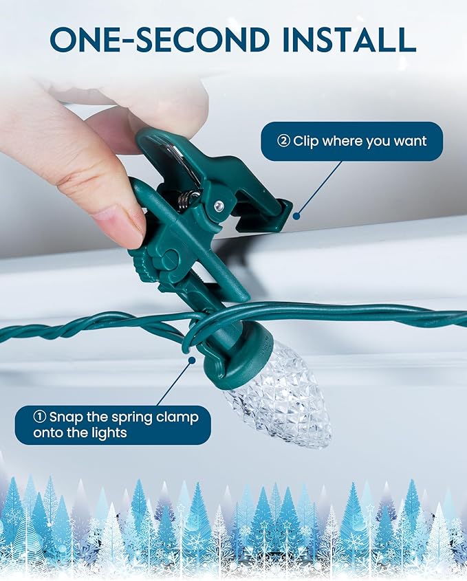 - 【One-second Set up & Removable Clips】 These energy efficient C9 LED Christmas lights Outdoor come with spring-loaded clips for quick installation, offering the option of fastening safely in a wider variety of settings (clips can also be removed if deemed unnecessary). Compared with regular roof clips for christmas lights outdoor C9, the spring-loaded clips can more firmly and securely clamp objects such as the roofline, railing or tree. Very suitable for outdoor and indoor use