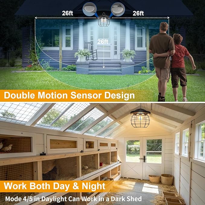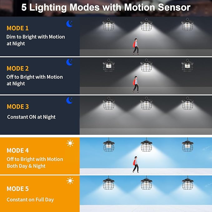 - 【Dual Motion Sensor Heads】Solar pendant light equipped with dual motion sensor heads, this lantern provides enhanced security and convenience. Solar motion light offers 5 modes split between night-only and all-day use. For nighttime, Mode 1 shifts from dim to bright on motion, Mode 2 turns on fully when motion is detected, and Mode 3 stays on at 70% brightness. For all-day use, Mode 4 activates full brightness on motion, while Mode 5 remains steadily lit at 70%. Modes 1, 2 and 4 are fitted with 360° motion sensors to balance lighting convenience and energy savings.