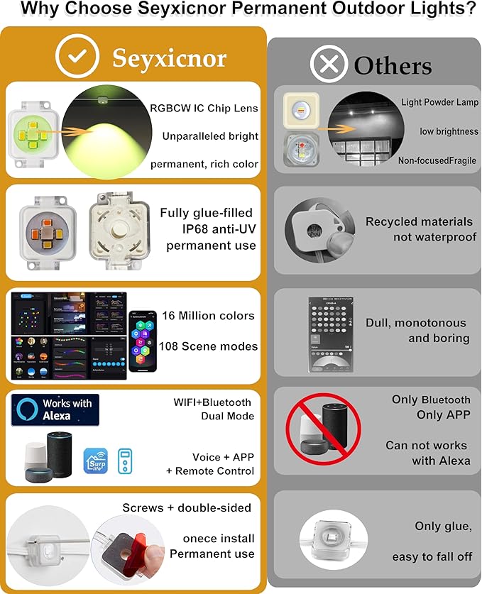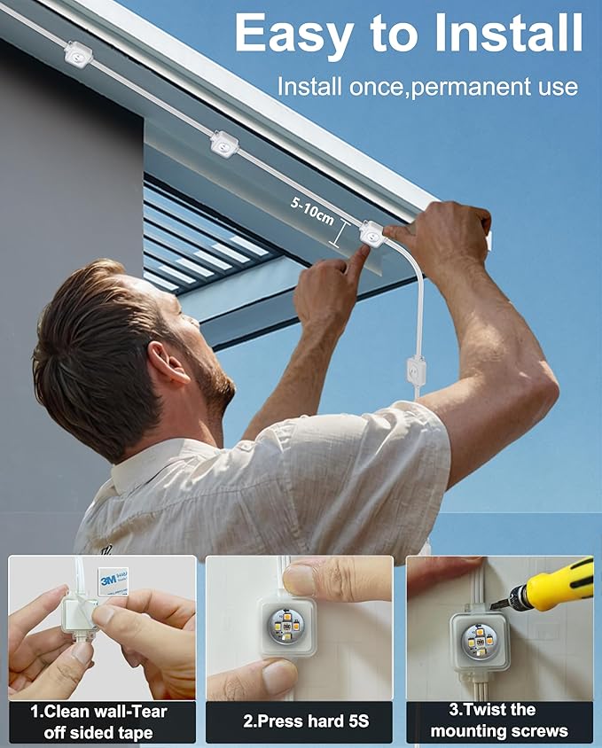 - Superior Value with Permanent Outdoor Lights for House: Higher LED density & optimized power deliver bright, even coverage. Easy peel-and-stick setup—install once on eaves, fences, or patios for year-round décor. Say goodbye to frequent replacements. Ideal outdoor christmas lights for House, New Year Halloween, Valentine's, Independence Day and more. A long-lasting, premium gift for any loved one.
