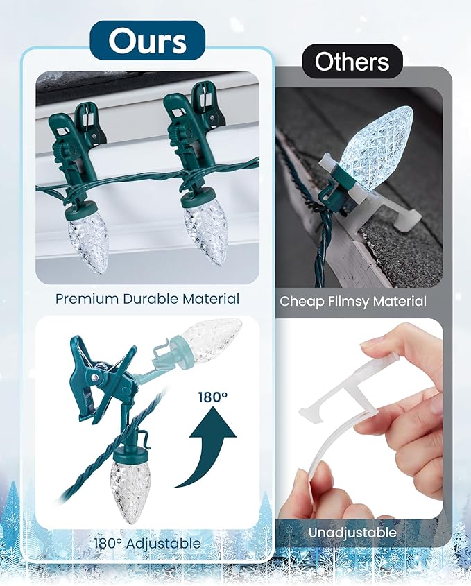 - 【One-second Set up & Removable Clips】 These energy efficient C9 LED Christmas lights Outdoor come with spring-loaded clips for quick installation, offering the option of fastening safely in a wider variety of settings (clips can also be removed if deemed unnecessary). Compared with regular roof clips for christmas lights outdoor C9, the spring-loaded clips can more firmly and securely clamp objects such as the roofline, railing or tree. Very suitable for outdoor and indoor use