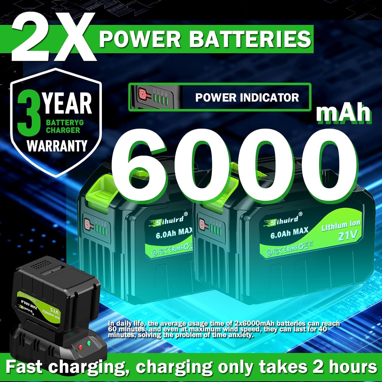 - 【Fast Charging】:The Sihuird Cordless Leaf Blower is equipped with a fast charger, and a 6000mAh high-capacity battery can be charged in just 2 hours.