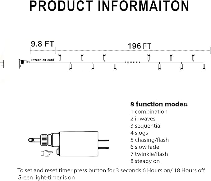 - 8 Lighting Modes and Timer: Our Christmas string lights offer 8 lighting modes, combination, in waves, sequential, slogs, chasing/flash, slow fade, twinkle/flash, and steady on, to suit various occasions. You can change the lighting modes by pressing the round button on the transformer. To set the timer (6h on/18h off), long press the round button until the green lights turn on