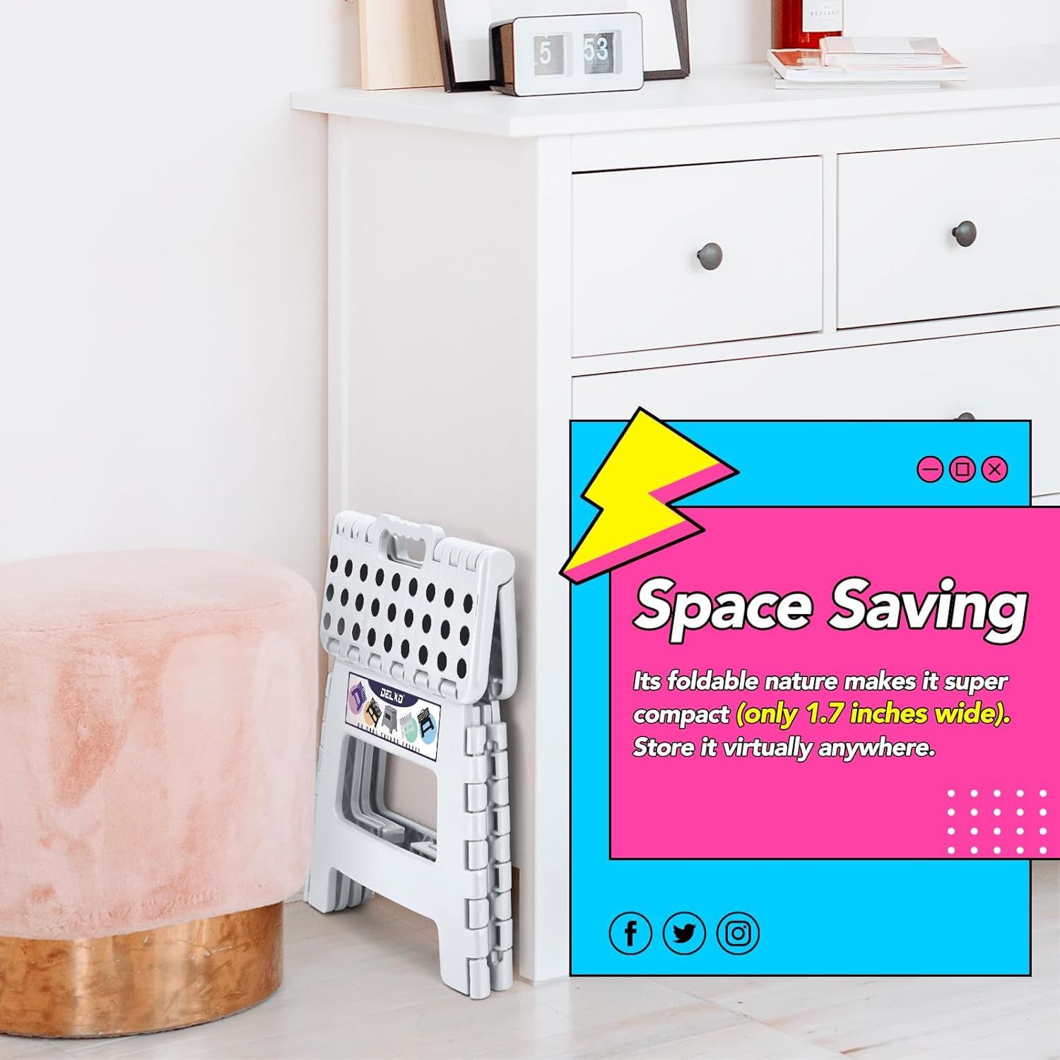 - Space-Saving Folding Stool: Designed to save up to 90% of space when folded, our kids foldable step stool is easy to store under the bed, in a closet, or in tight spaces between furniture, it also fits perfectly in your car trunk—ideal for small apartments and road trips