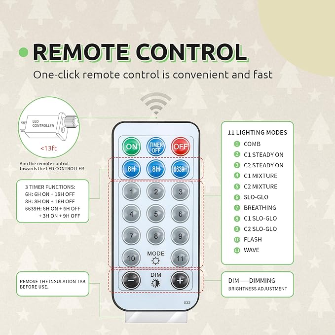 - Brighten Every Moment with a Click: This Christmas tree features 260 built-in LED lights in warm white, multicolor, or both. With 2 color settings and 11 lighting modes, you can set the ideal mood using the remote from up to 13 feet away