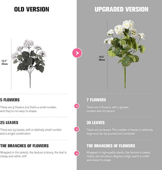 - The upgraded artificial geranium bouquet now features 7 blooms and 30 leaves—2 more blooms and 5 more leaves than the previous version—creating a fuller, more layered appearance.The stems are softer in texture for easier shaping.