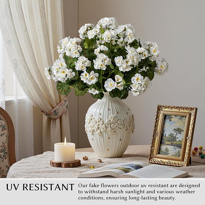Artificial Geranium Flowers for Outdoors Geraniums Artificial Flowers Realistic Faux Geraniums for Outdoor Planters Silk Geranium Outdoor Fake Flowers Porch Home Kitchen Garden Decor(4PCS,White)