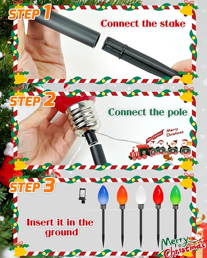 - [C9 LED outdoor Christmas lights]: Our C9 Christmas Decorations are 8.5ft in height, total 2 strings with 10pcs of strawberry bulbs and 10pcs of sturdy stakes. Each bulb is in larger size 2.8"*5.9" compared with other small size 1.1*2.9" , Christmas colored bulbs with diamonds surface with twinkle effects, plug in Christmas Path lights outdoor are perfect for your trails, garden, patio and yard decor.