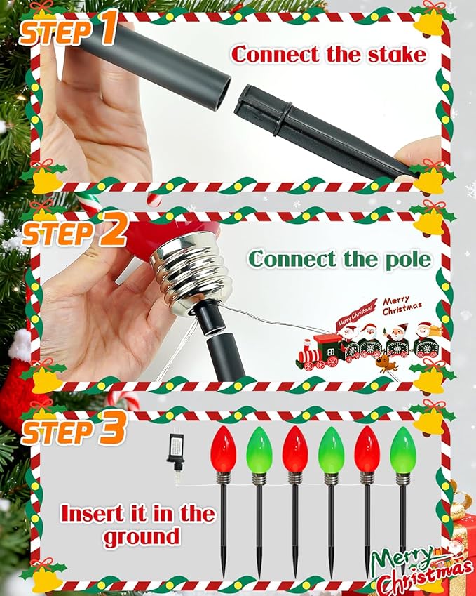- [C9 LED outdoor Christmas lights]: Our C9 Christmas Decorations are 8.5ft in height, total 2 strings with 12pcs of strawberry bulbs and 12pcs of sturdy stakes. Each bulb is in larger size 2.8"*5.9" compared with other small size 1.1*2.9" , Christmas colored bulbs with diamonds surface with twinkle effects, plug in Christmas Path lights outdoor are perfect for your trails, garden, patio and yard decor.