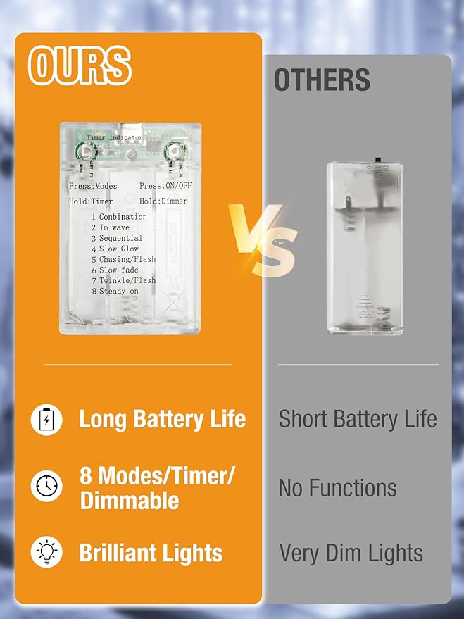 - Timer Function and Long Battery Life: The fairy lights has a timer function. Press and hold the left button for 2 seconds until the ‘Timer’ indicator light turns on, and the lights will automatically steady on for 6 hours and then turn off for 18 hours. Fairy lights with timer helps save energy and extend battery life, with the light string capable of continuous illumination for up to one week