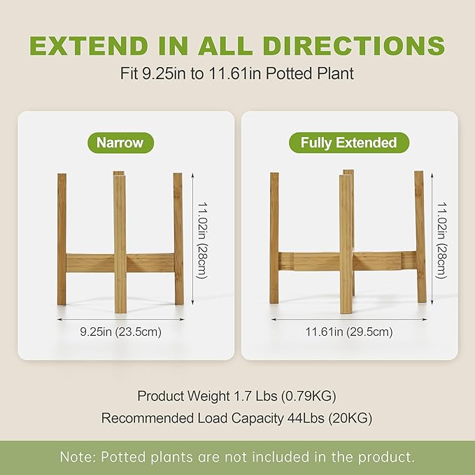 Adjustable Plant Stand Indoor with Detachable Wheels Bamboo Mid Century Modern Plants Stands Expandable Plug in Assemble Flower Pot Stand,Fit 9.25" to 11.61", Natural