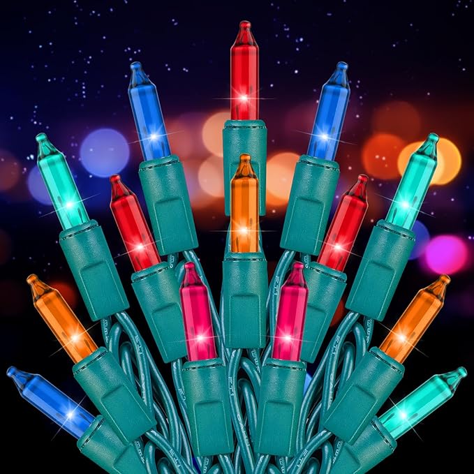 - 【Festive Mini Christmas Lights Set】This set includes 200 mluticolored incandescent mini-lights on 51.5 ft green wire, with bulbs spaced 3-inche apart and 18-inch lead wire. Perfect for holiday decorating, with the ability to connect up to 2 light strings end-to-end;