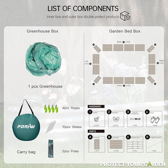 - 【Space-Optimized, Compact Design】With a greenhouse measuring 8.2 ft L x 4.1 ft W x 4.3 ft H and a garden bed at 7.7 ft L x 4.2 ft W x 1 ft H, both are designed for compact spaces, perfect for small yards, balconies, or any limited outdoor area. We also prioritize packaging efficiency; the 24x24x9.5 inch box (N.W. 40 lbs, G.W. 43 lbs) is convenient for shipping and storage, helping you easily plan your garden space.