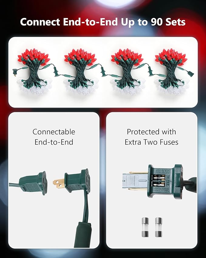 - 【End to End Connectable】Simply, plug in and go! you can connect up to 90 sets together, and connect easily to your previous lights, end-to-end up to a maximum 216Watts(1.8Amps) total. It can meet your desired length and make your decoration more convenient. Each set comes with 2 extra replacement fuses.