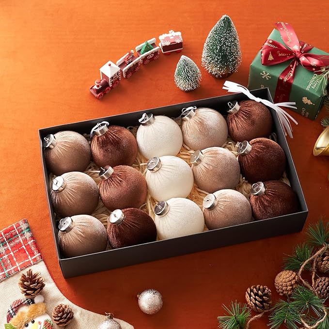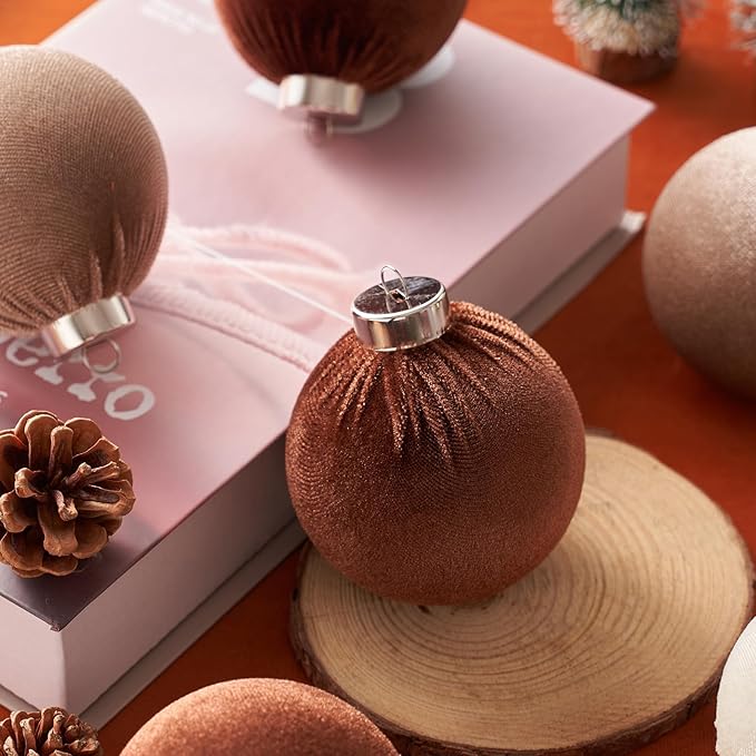 - Classical Christmas Ball Ornaments - Our Christmas velvet balls set has feature colors to provide an exquisite look for your Christmas tree to decor a perfect Xmas. Our Christmas Decoration Set has 3 white balls, 6 coffee balls, 6 brown ball, totally 15 pieces per box, and they are all 3.15 Inch.