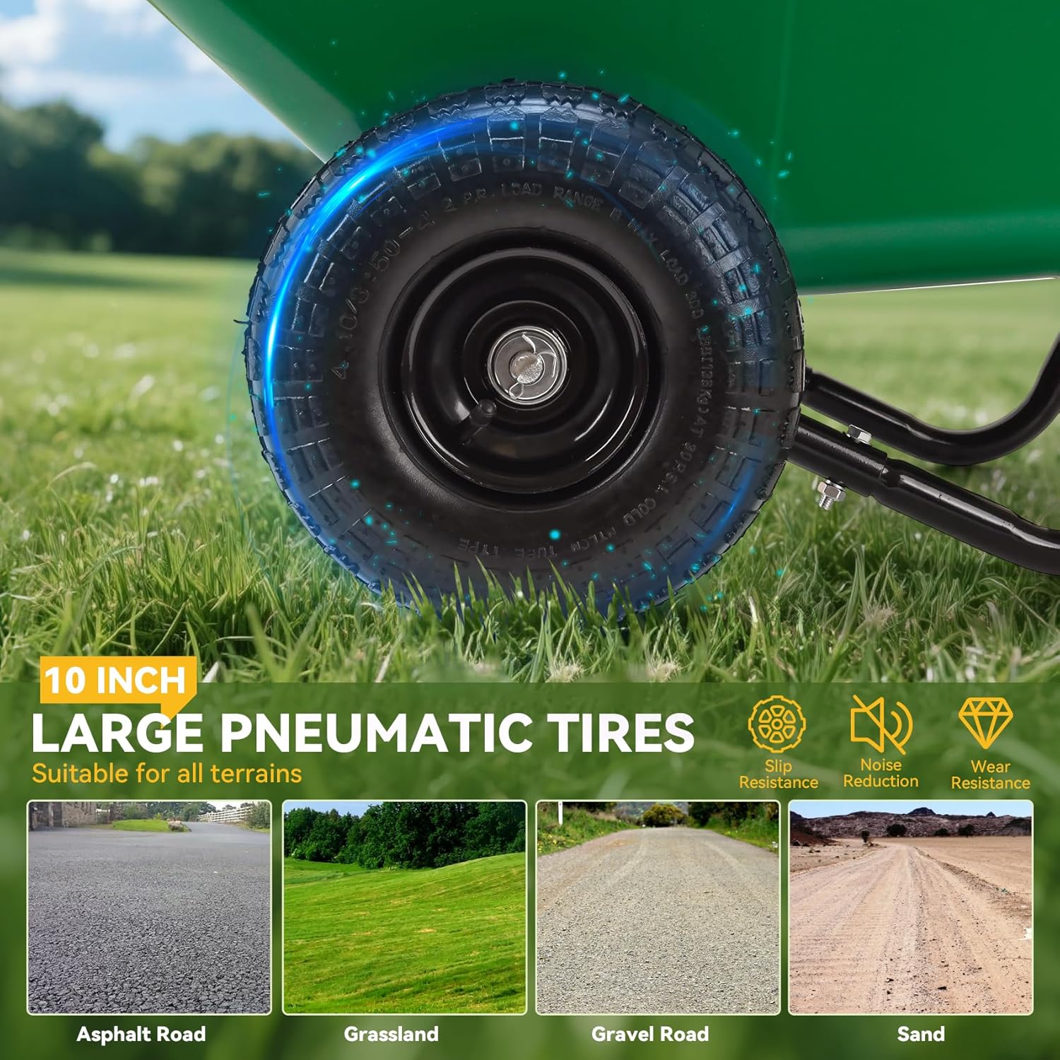 - Heavy-Duty Dual Pneumatic Wheels for Smooth Mobilit:Equipped with 10-inch (26 cm) pneumatic tires,this wheelbarrow ensures superior shock absorption and traction on rough terrains like gravel,sand,grass,and uneven pavement.The air-filled tires reduce noise and rolling resistance,making it effortless to transport heavy loads.The dual-wheel design enhances stability,preventing tipping even on slopes or bumpy ground.