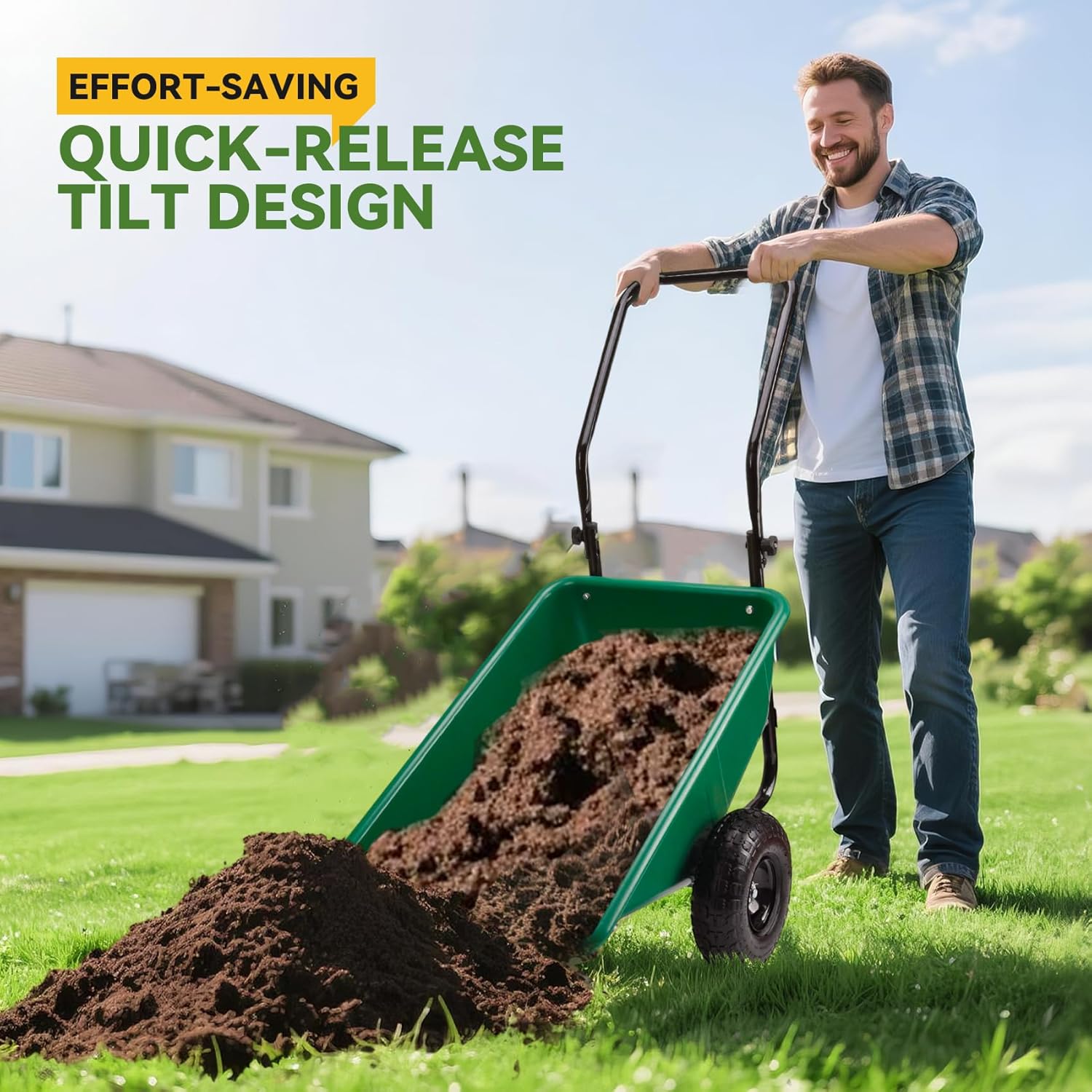 - Quick-Release Tilt Mechanism for Effortless Unloading:The one-handed quick-release lever enables smooth,controlled dumping of contents without heavy lifting.Simply pull the lever, and the bin tilts forward,making it perfect for repetitive yard work, construction sites,or farm use.The hassle-free design saves time and reduces physical strain.