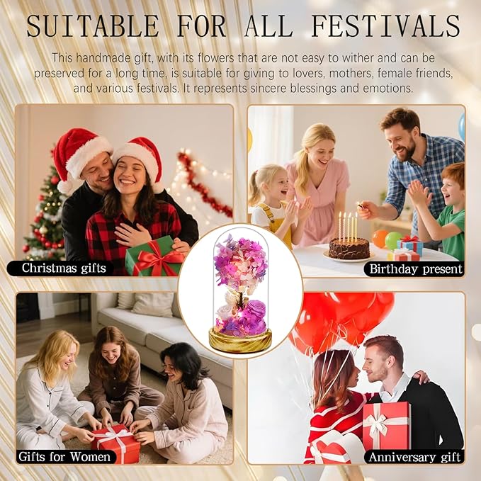 dranmoner Preserved Flower Glass Dome with LED Lights, Handmade Fantasy Purple Hydrangea and Roses Arrangement, Wood Base, for Mom Grandma Wife Friend Used as for Occasions Home Decor