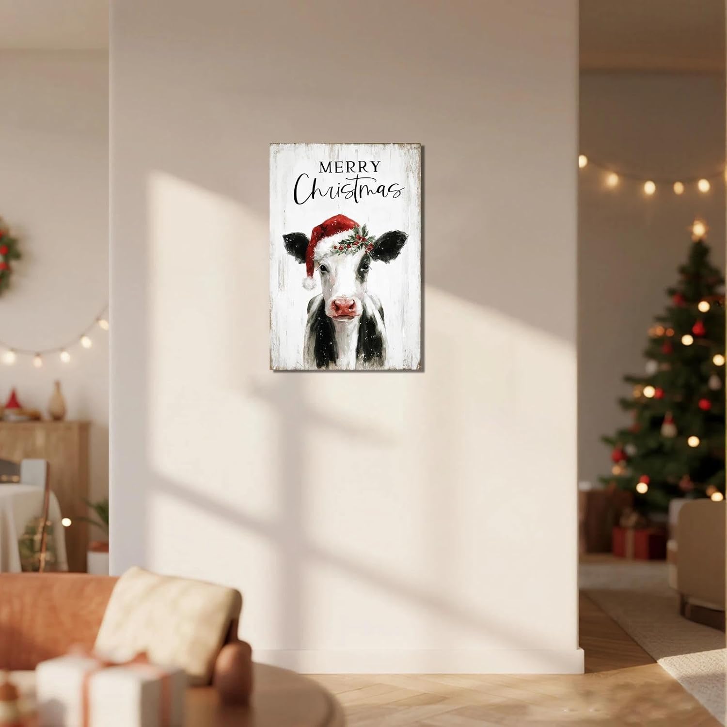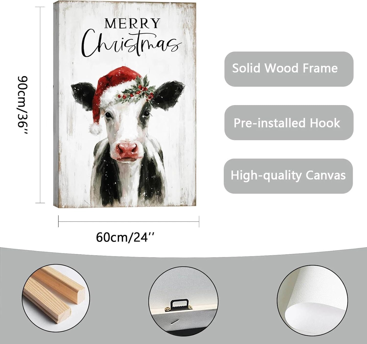 Christmas Cow Canvas Wall Art – Framed Farmhouse Decor for Xmas, Ready to Hang Print Holiday Gifts for Bedroom & Living Room Indoor 24x35 Inch