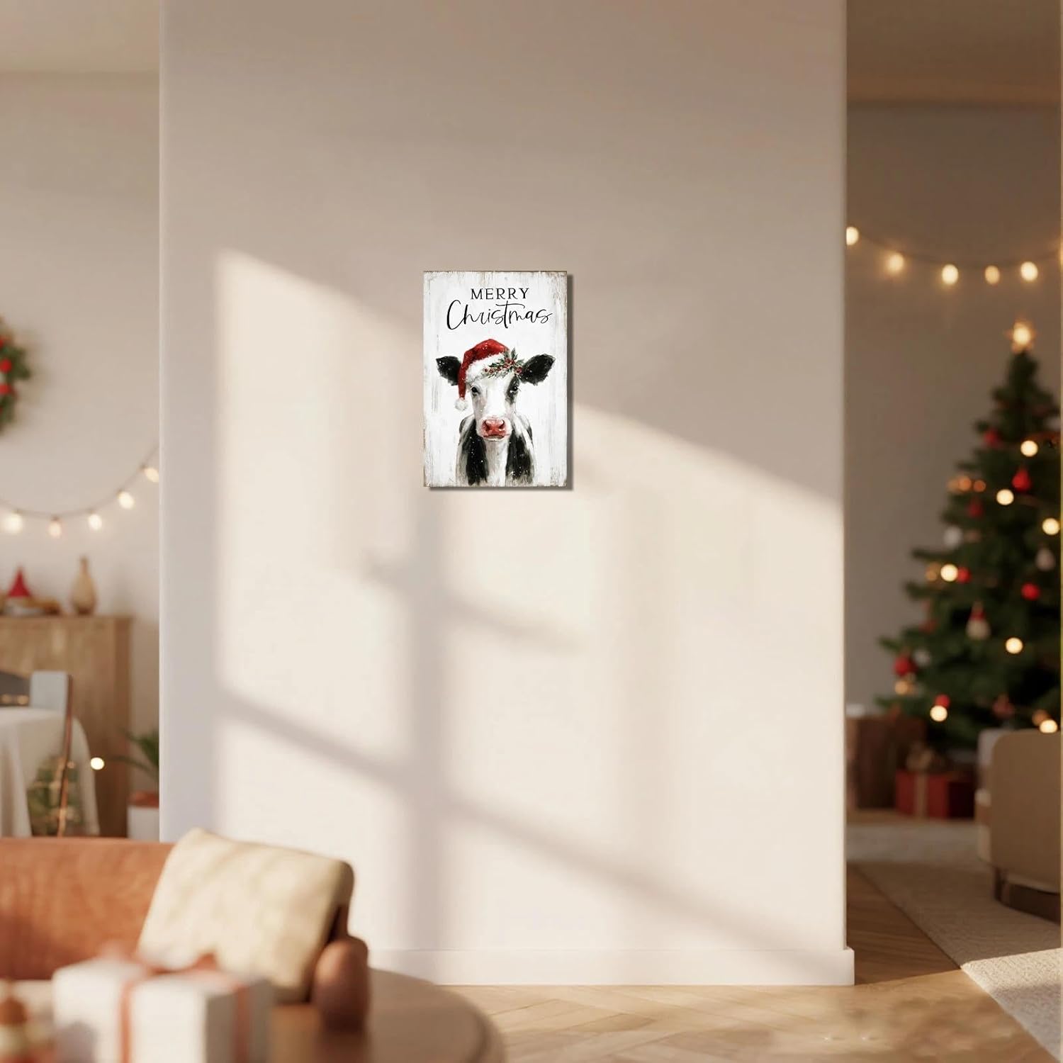 Christmas Cow Canvas Wall Art – Framed Farmhouse Decor for Xmas, Ready to Hang Print Holiday Gifts for Bedroom & Living Room Indoor 10x15 Inch