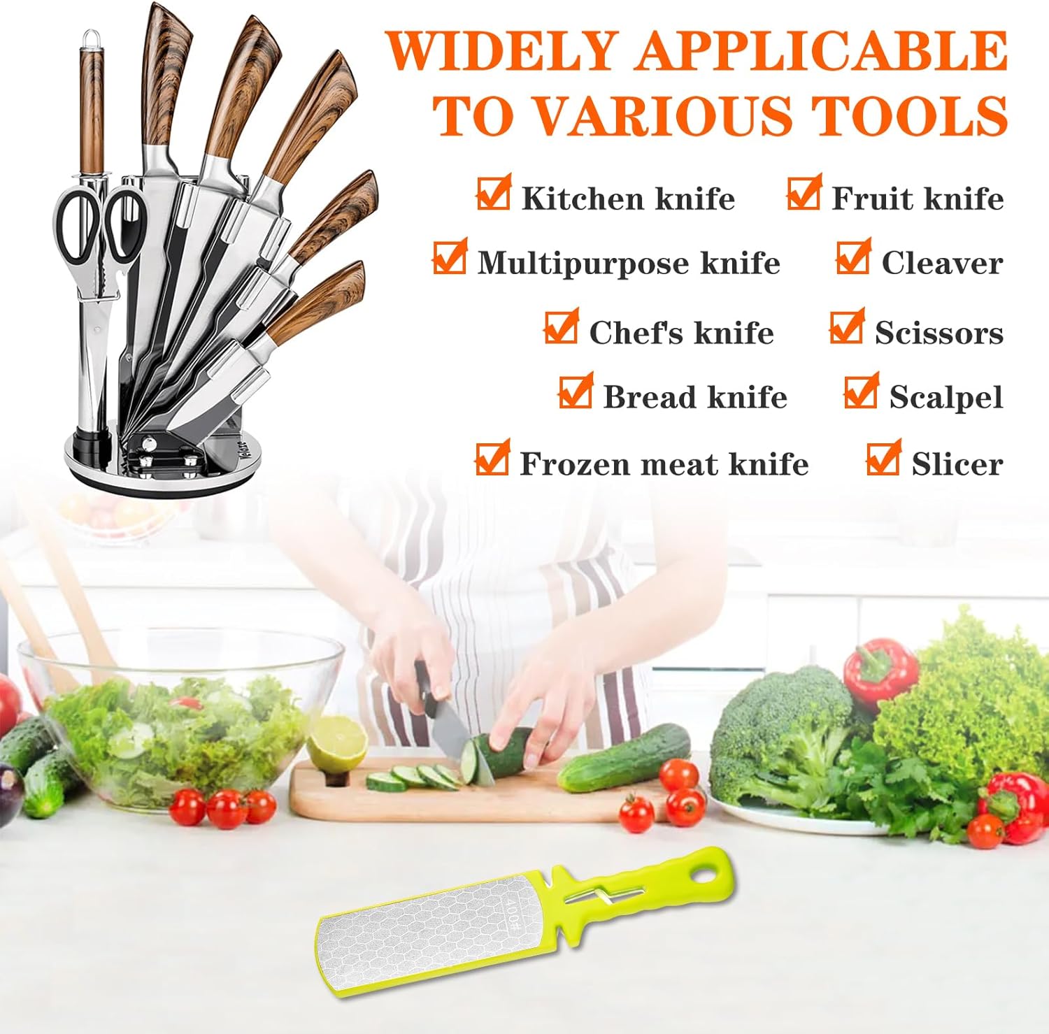 - Portable Size: The size of the 5 in 1 knife sharpener is about 11x2.17 Inches (L x W), with a hanging hole,It's convenient to storage and save space. What a perfect kitchen gift for your family & friends!