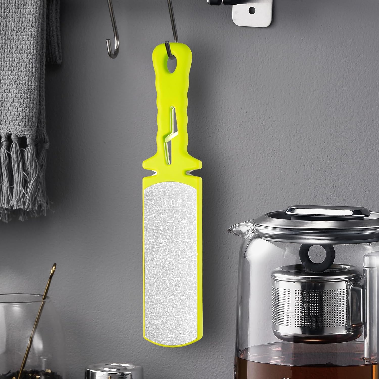 - 5 in 1 Sharpening Stone:The front side 400# coarse sharpening is used to repair severely dulled blades, and back side 1000# fine sharpening is used to re-sharpen the edges and deburr the blade. The lightning slot in middle of handle is for Scissors Grinding. Left waist of the handle is tungsten steel blade sharpens to restore the knife's V-shape,and the right waist of the handle is ceramic blade sharpens for polish and eliminates burrs on the metal blade.