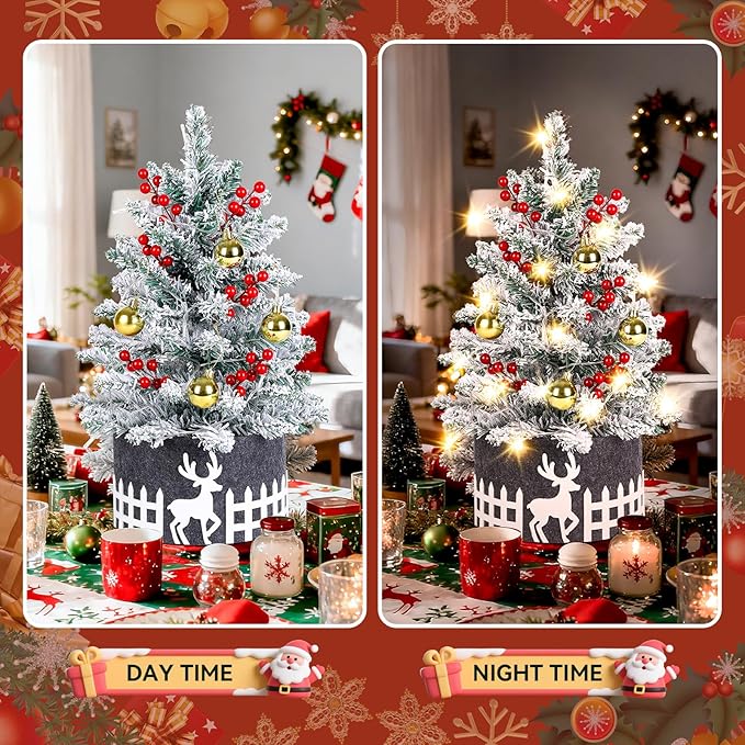 - Snow Flocked Mini Christmas Tree with Lights: This 60cm/2ft flocked Christmas tree features a realistic snow-dusted look, pre-lit with white LEDs (battery-operated, batteries not included). Decorated with red berries, classic ornaments, and a festive tree skirt, it brings a traditional Christmas vibe to any room. Perfect for tabletop Christmas decor and holiday centerpieces
