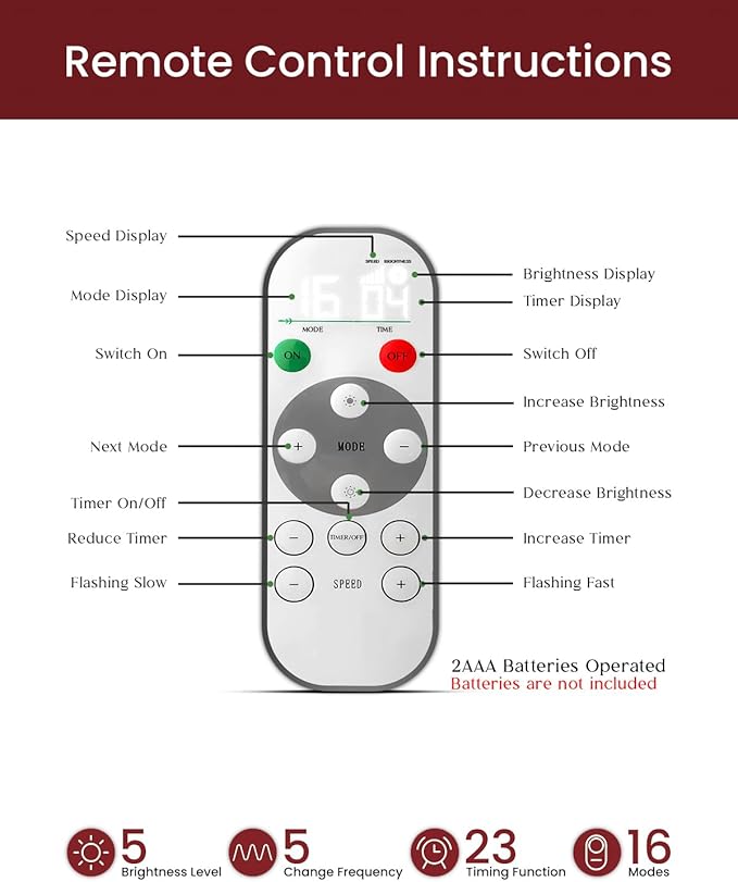 - Remote: Christmas tree has 5 brightness levels and 16 lighting modes. There are 23 Timer types and Memory Function. You can change lighting modes by remote control. The remote control operated by 2AAA battery. (Note: batteries are not included.)