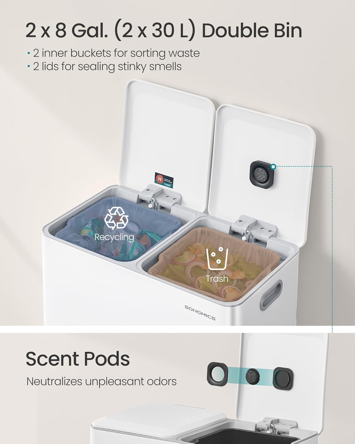 • Ready to Use: This double trash can includes 15 trash bags for immediate use and is compatible with SONGMICS 8-gallon trash bags (code H). The inner bucket features a bag hole to keep liners securely in place