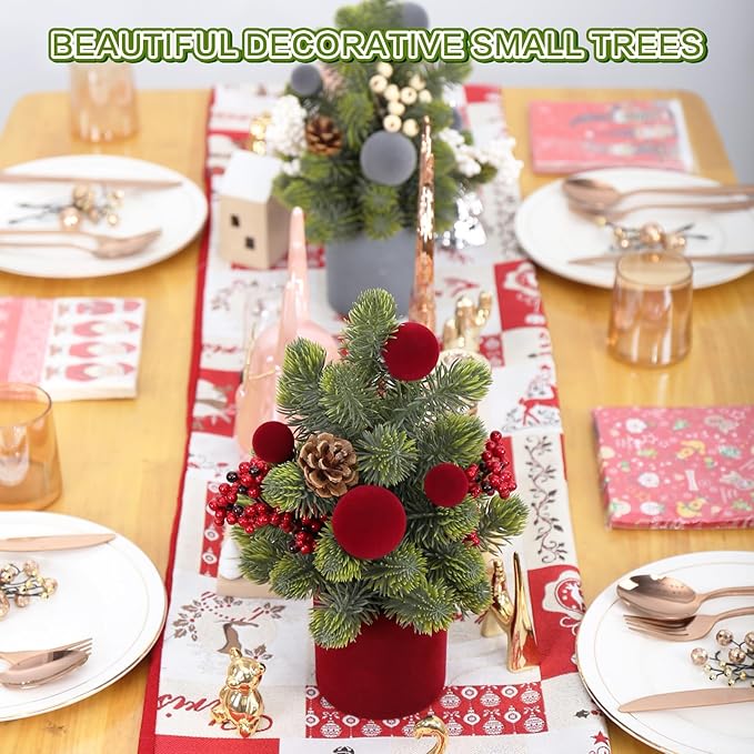- CHRISTMAS DECORATIONS: The exquisite little Christmas tree is adorned with grey velvet balls, pine cones, and berries, blending traditional holiday charm with modern elements to create a unique holiday focal point.