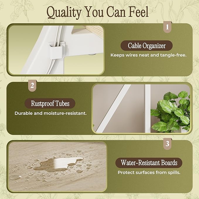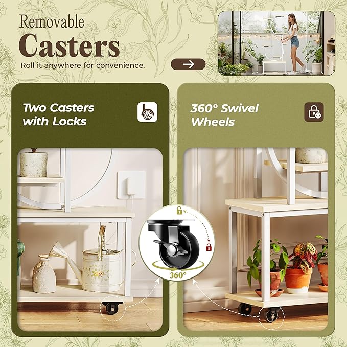 - 【Sturdy & Durable】Crafted with a strong metal frame and thick particleboard, this plant stand with grow light stays stable even when fully loaded. The anti-rust coating and waterproof surface make cleaning easy. Base wheels let you move it effortlessly, while cable clips keep cords tidy and safe