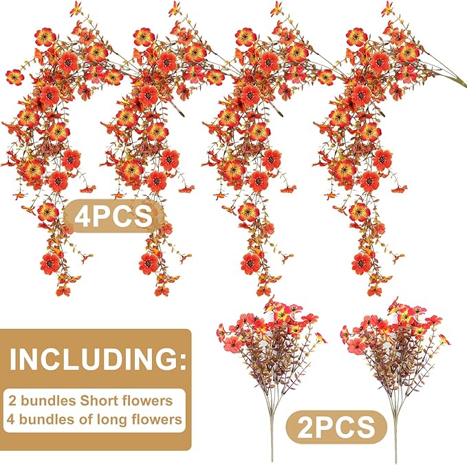 Outdoor Artificial Fall Flowers 6PCS, All Weather Fade Proof, UV Resistant Waterproof Realistic Faux Silk Mums Daisies Orange & Sunset Red for Hanging Planters Porch Patio Balcony Deck & Garden Decor