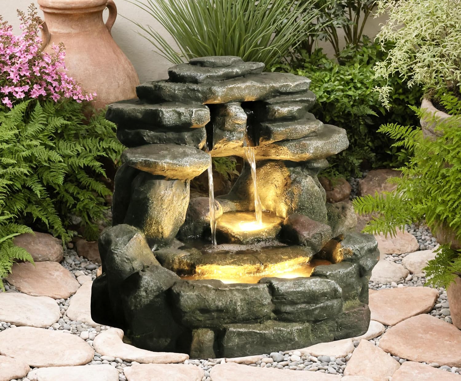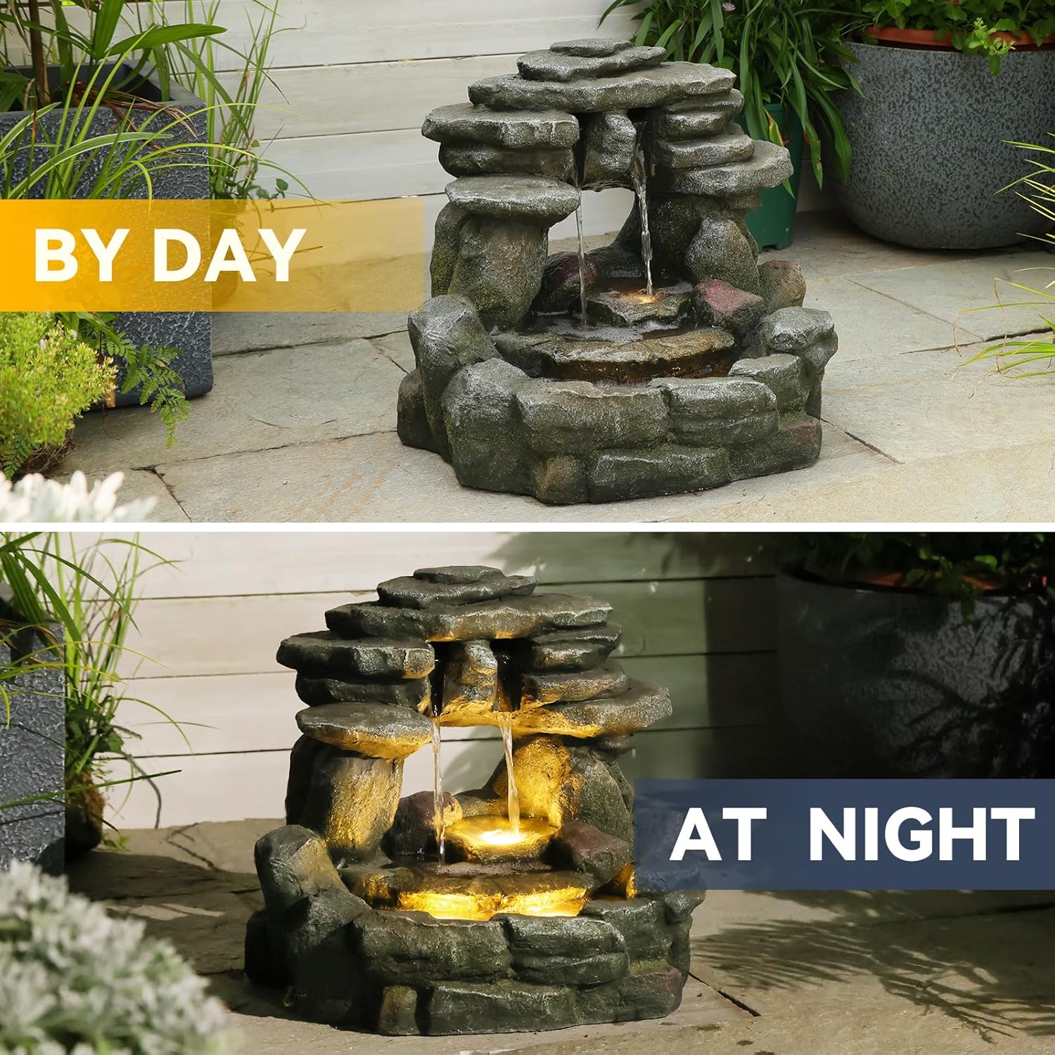 - GARDEN DÉCOR & LIGHT: This yard fountain has 3 tiers in total, with warm LED lights on the bottom 2 tiers, the adjustable water gracefully flows over the glowing tiers in the dark. It's perfect for your porch, garden, or inside area