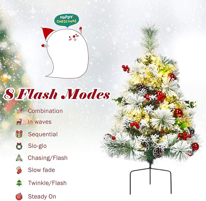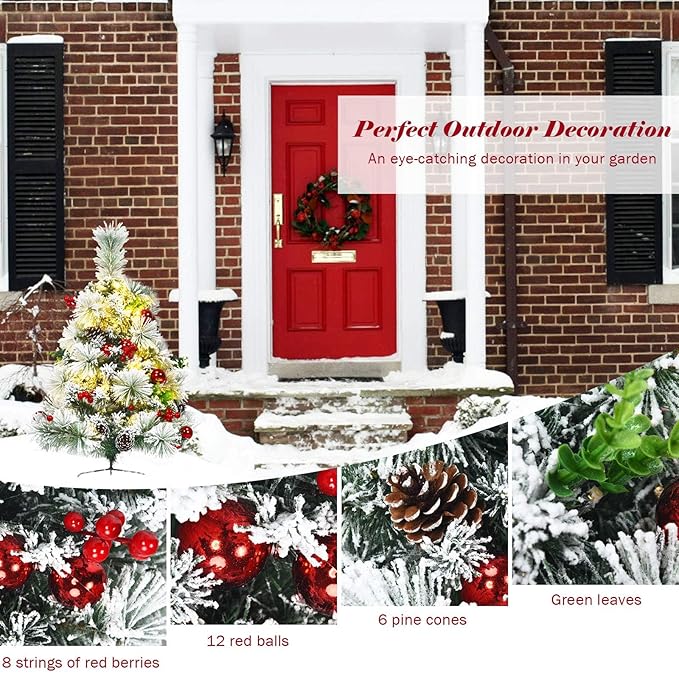 - 【Snow Flocked Pathway Christmas Tree】 Our pathway Christmas trees enjoy lush and snow flocked branches. Realistic pine cones, red berries and green leaves create a luxurious appearance. The Christmas tree will well garnish your pathway and increase the spirit of the festival!