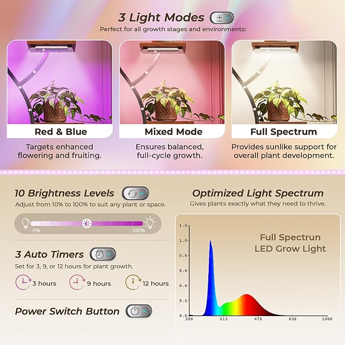 - 【Full-Spectrum Grow Lights】No more chasing sunlight! This indoor plant stand comes with 3 full-spectrum LED grow lights that keep your plants thriving all year long. Choose from 3 timer settings (3/9/12H) and 10 brightness levels to match every plant’s needs. With 3 light modes — Full Spectrum, Red & Blue, and Mixed — your plants get the perfect glow for every stage, from seedlings to bloom. Plus, the smart memory function remembers your last setting