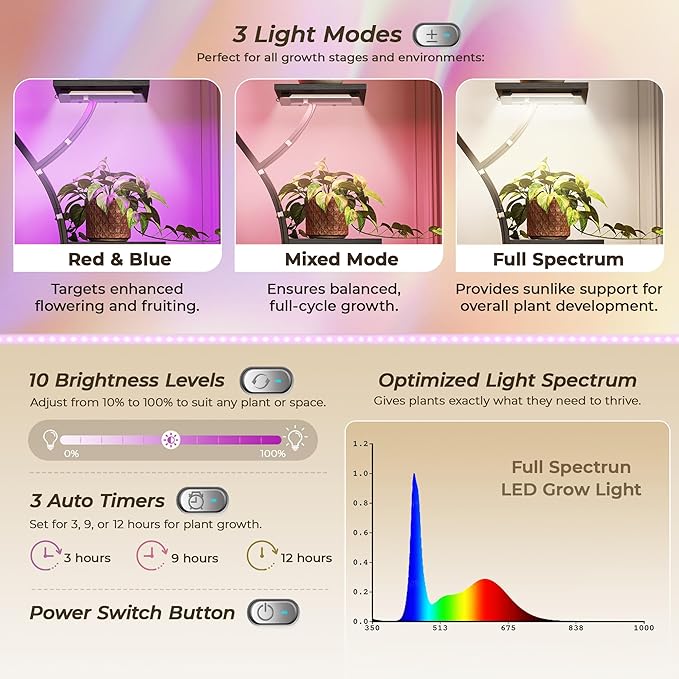 - 【Full-Spectrum Grow Lights】No more chasing sunlight! This indoor plant stand comes with 3 full-spectrum LED grow lights that keep your plants thriving all year long. Choose from 3 timer settings (3/9/12H) and 10 brightness levels to match every plant’s needs. With 3 light modes — Full Spectrum, Red & Blue, and Mixed — your plants get the perfect glow for every stage, from seedlings to bloom. Plus, the smart memory function remembers your last setting