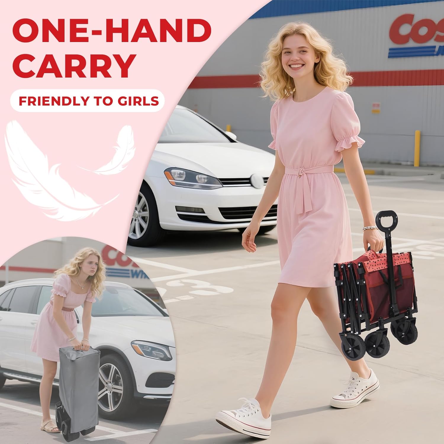 - We Heard You:Meet the ultra‑light Portable DUHKOI folding wagon—just 11 lbs, lighter than a small dog and friendly to every girl out there. One hand lifts it, no sweat, no strain. Say goodbye to sore backs and hello to the prettiest, easiest version of you—anywhere, anytime