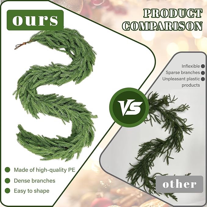 - Real Touch Christmas Garlands: Our Norfolk Pine garland are the ultimate in artificial elegance. They maintain a perpetually fresh and vibrant appearance, as if time has no hold on them. Never worry about wilting or decay; these garland stay beautiful year-round with zero maintenance required. It's durable and waterproof, can be decorated indoor and outdoor
