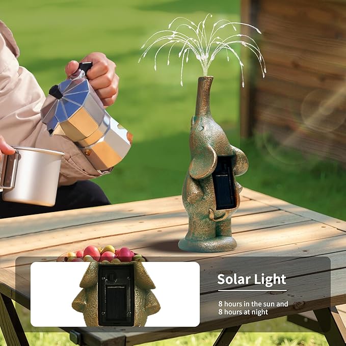 - Multifunctional Decor: Featuring a 360-degree intricate elephant design, its water-spouting pose evokes the image of bestowing life upon flowers. With an antique-inspired finish, it enhances gardens day and night, serving as a captivating focal point.