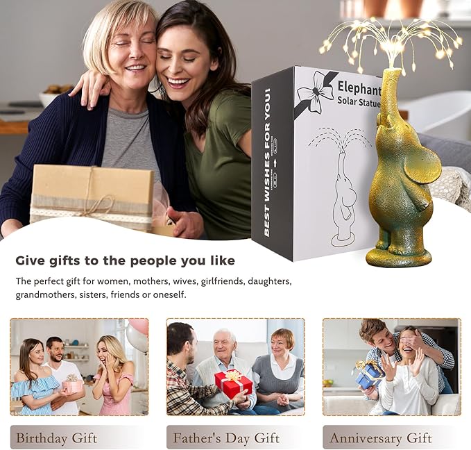 Elephant Statue Outdoor Solar Lights Garden Sculpture, 60 LED Chips Birthday Gift Women,Mothers,and Elders. Ornamental Piece for Balconies, Gardens, patios, courtyards, and lawns