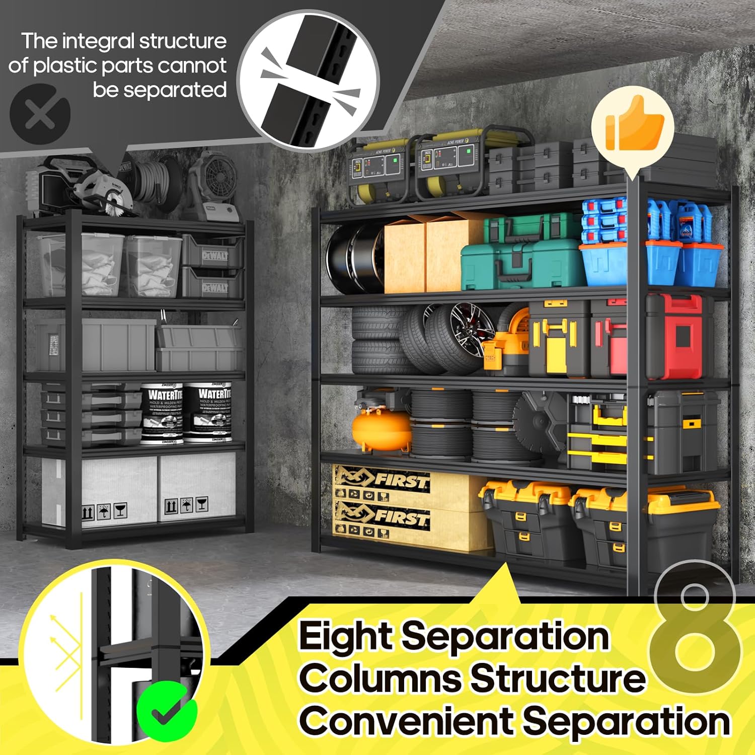 - 【Versatile Garage Organization System】 Use as one tall garage storage rack or split into two smaller shelving units for flexible placement. Perfect for garage organization systems, garage storage shelves, or even as estantes de almacenamiento for basement and commercial use.