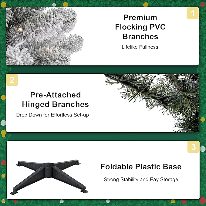 - Hinged Design & Plastic Stand for Easy Setup The hinged structure makes branch shaping simple—just attach, drop down, and fluff. Includes a lightweight yet sturdy plastic stand to keep your Christmas tree flocked and secure all season.