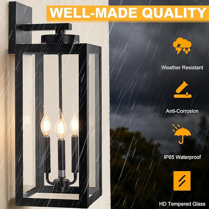 - 【Weather-Resistant Build for Year-Round Durability】Designed to withstand the elements, these black outdoor lamps feature a heavy-duty metal frame and thickened glass panels that resist rust, corrosion, and wear. Whether it's heavy rain, snow, or extreme heat, these waterproof outside sconce lights maintain their beauty and performance, making it a reliable lighting choice for any climate. Upgrade your outside house with Yolsunes large 24-inch exterior wall lanterns.
