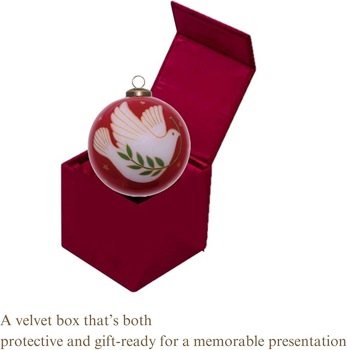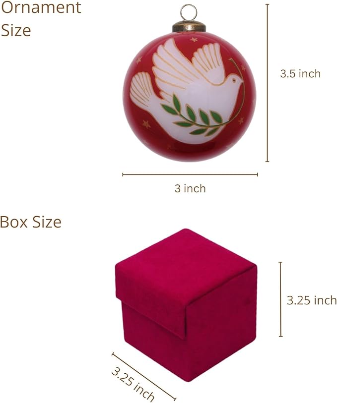 - UNVEIL THE BEAUTY WITHIN】 Reverse-painted from the inside of blown glass, this ornament is a radiant tribute to global peace and goodwill. Its brilliant red background contrasts beautifully with the white and gold details, creating a striking visual that uplifts any holiday décor.