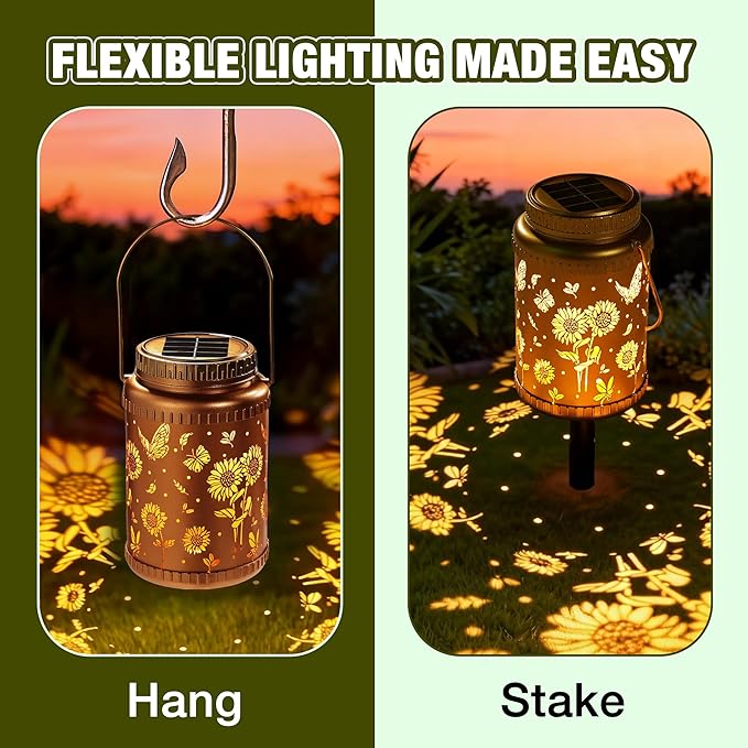 - 《 Storm-Proof & Weather-Ready Design 》Wind, rain, or intense sun — your Sunflower lantern stands firm. The spiral-lock solar lid screws tightly into the frame and won’t loosen even during storms. Reinforced metal detailing and weather-resistant sealing ensure steady, reliable performance season after season.