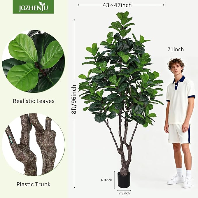 - [Perfect 8ft Size] Standing at an impressive 8 feet tall, the faux plants indoor is the ideal choice for creating a bold yet elegant statement in any space. Its height is perfect for rooms with high ceilings, open areas, or as a striking focal point in your home or office. The tall yet slim profile ensures the fiddle leaf fig tree complements the space without feeling overwhelming, adding a touch of grandeur and sophistication to your decor.